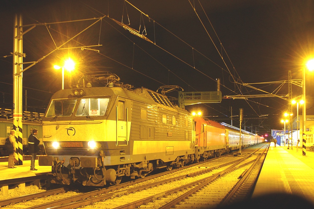 V nedeľu 19.10.2008 sa na vlaku EC70 Antonín Dvořák uskutočnila preprava taurusu 1216.239 do Prahy, ktorý v Prahe slúži ako školiaci rušeň pre rušňovodičov DKV Praha, PJ Vršovice. Snímok zachytáva odchod vlaku zo stanice Břeclav s príprahom 350.019. S týmto rušňom sa v najbližšej dobe budeme môcť stretnúť aj na vozbe Brněnských expresov, poprípade ho uvidíme ako náhradu rady 371 na EC v úseku Praha - Dresden.