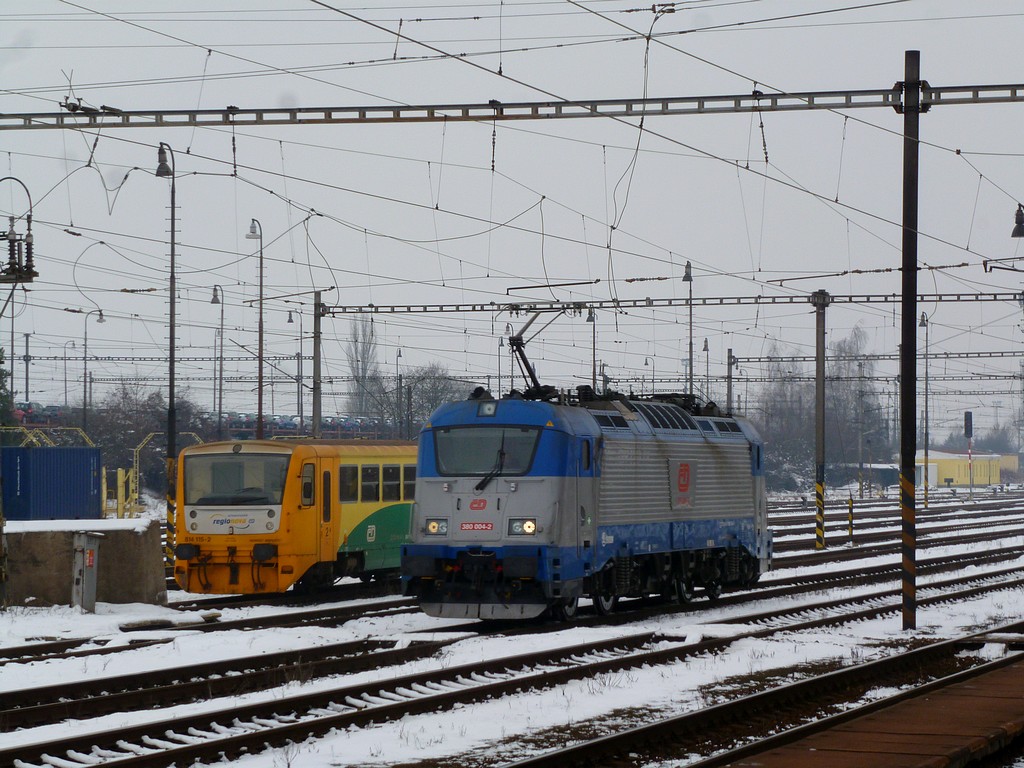 Digitálny podúrovňový sústruh v nymburskej DPOV kvôli počasiu maká naplno, a dnes sa v Nymburku objavila aj 380.004, ktorá si prišla prezuť papuče. Na snímke už po sústružení posunuje po Nymburk hl.n.po 6, staničnej koľaji vedľa odpočívajúcej regionovy 814.115.