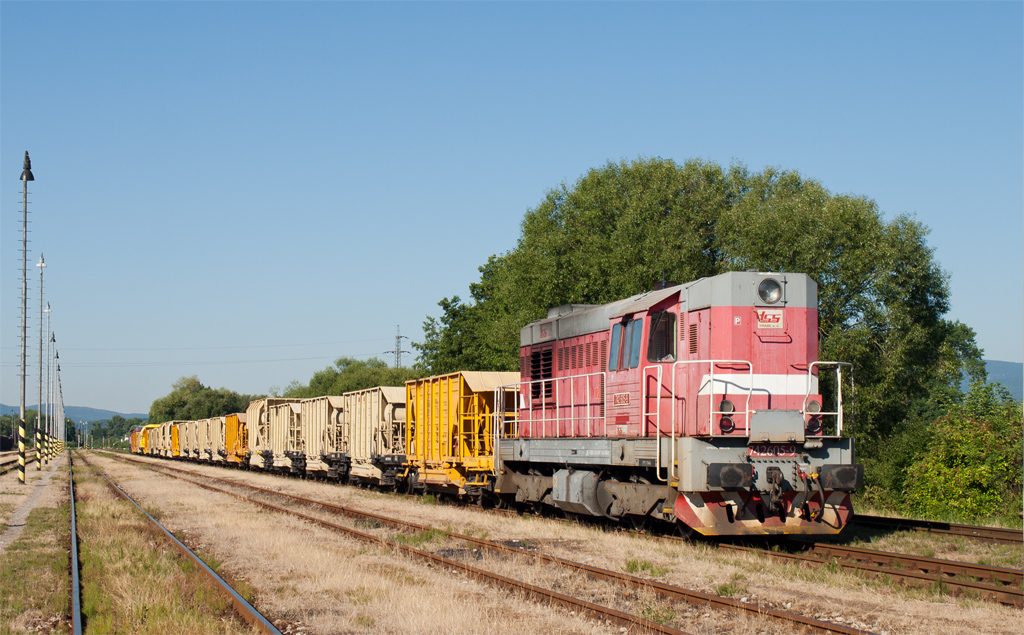 Dnes sa mi v čase prejazdu R 722 podarilo zastihnúť v prievidzskej nákladnej stanici vlak spoločnosti TSS, idúci po kameň do Bystričian. Ako sa mi podarilo zistiť, išiel z Beluše cez Žilinu a Hornú Šubňu. Ložený už išiel cez Chynorany a Trenčín späť do Beluše. V podaní TSS to nebol prvý takto trasovaný vlak, AWT chodilo z považia vždy cez Chynorany. V Prievidzi bola 742.605 na závese nečinná, vpredu bola 742.644.