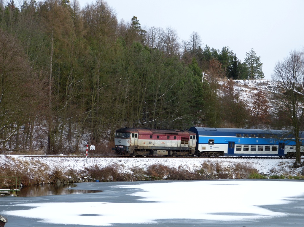 Odjezd lokomotivy 749 253 s os 9058 u Svárovského rybníku.