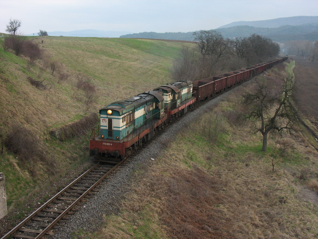 Nakladny vlak z Filakova do Somosku Ujfalu - MAV. V cele stroje 770 052 a 770 053 a na postrku 771 076 a 771 092