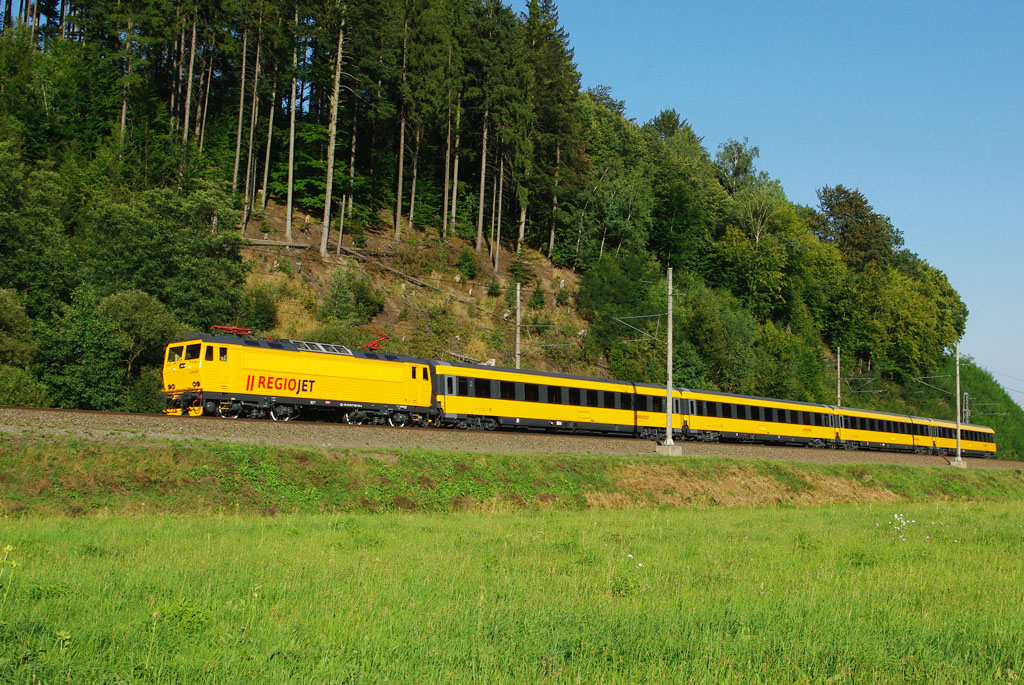 Mimoriadny vlak 1. nsl 1615 dopravcu RegioJet v čele s italošingom 162.114 zachytený v traťovom úseku Lupěné - Hoštejn