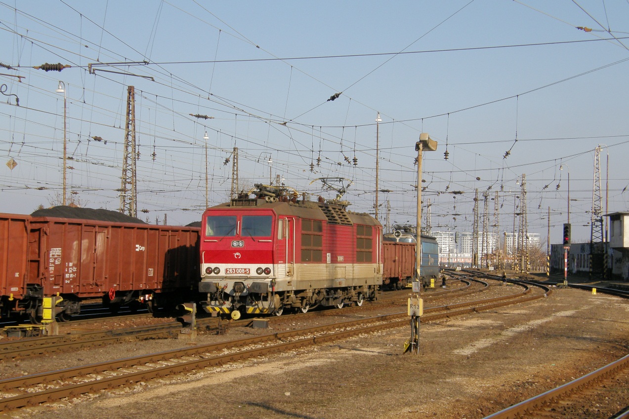 263 008-5 zachytená pri posune v žst. Bratislava hl., v pozadí prechádzajúci nákladný vlak v čele s 230 025-9