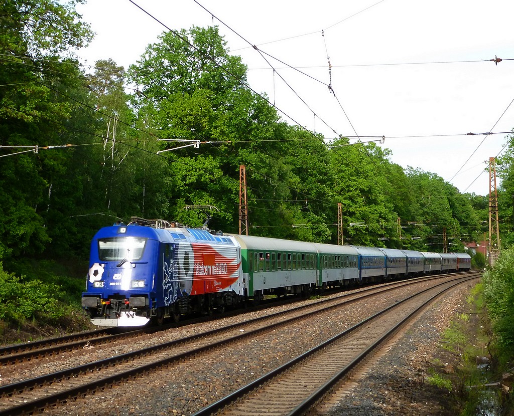 Dnes sa do domovskej Prahy vrátila reklamná krásavica 380.011, ktorú som zachytil neďaleko zastávky Praha Klánovice v Klánovickom lese. Rušeň išiel dopredu modrým čelom a na bočnici má českého leva. Okamžite po jeho uvedení do prevádzky v tomto nátere sa stal stredobodom pozornosti a záujmu širokej verejnosti. Pre zaujímavosť uvádzam jeho 2-dňový obeh: 1. deň: EC 111 Praha :Praha hl.n. - Bohumín, EC 137 Moravia: Ostrava hl.n. - Břeclav 2. deň: EC 136 Moravia: Břeclav - Ostrava hl.n., EC 110 Praha: Bohumín -Praha hl.n. z Prahy s bielym čelom do Prahy s modrým čelom