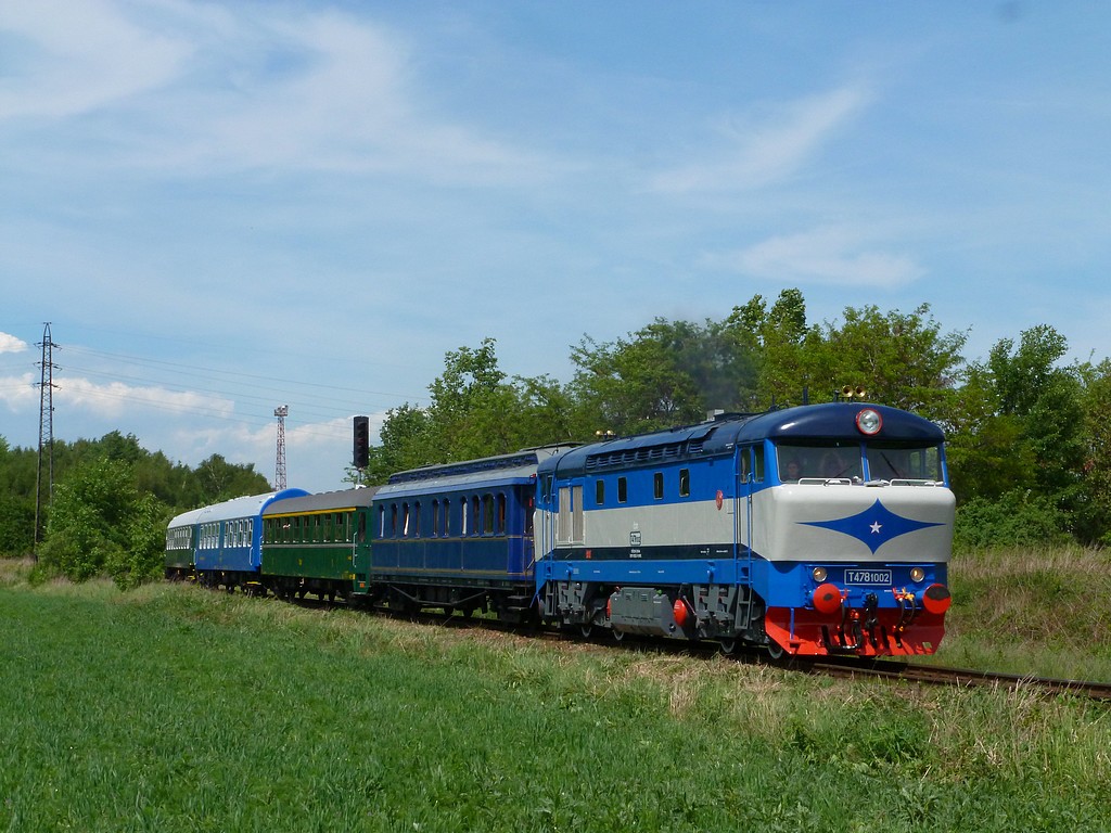 Dnes bol pri príležitosti oficiálneho otvorenia sezóny Depa historických vozidiel v Lužnej u Rakovníka vypravený protokolárny vlak zo stanice Praha Masarykovo nádraží - Lužná u Rakovníka a späť, ktorý bol radený výlučne z historckých vozňov a v čele tohto zvláštneho vlaku sa zaskvela prototypová bardotka T478.1002. Snímok z Kladna zachytáva tento vlak na spatočnej ceste do Prahy.