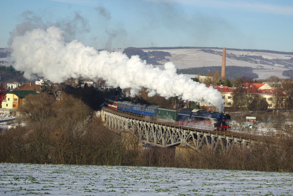 parní lokomotiva 498.104 odjíždí ze stanice Myjava