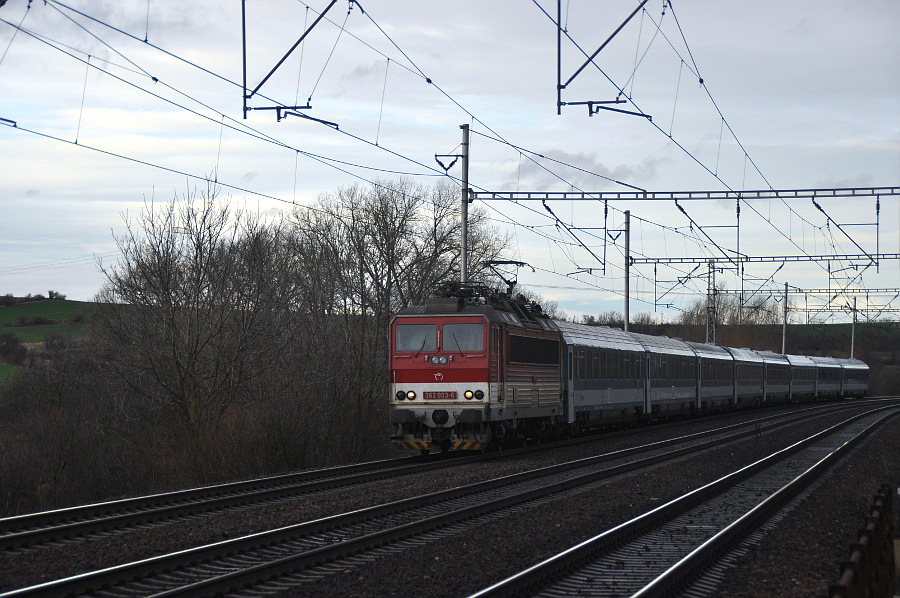 EC 170 Hungária s 362 003-6 ujíždí po 2. traťové před EC 110 Klučovem. Nevím proč jsem si oblíbil sledovat co přijede dřív Hungaria nebo Praha?