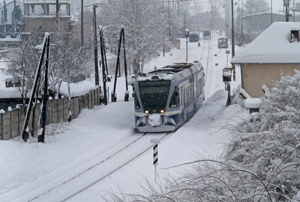 Zmeškaný Os 8313 ( Zssk 840 003-8 ) sa rozbieha zo žst Podolínec v snehovej metelici,