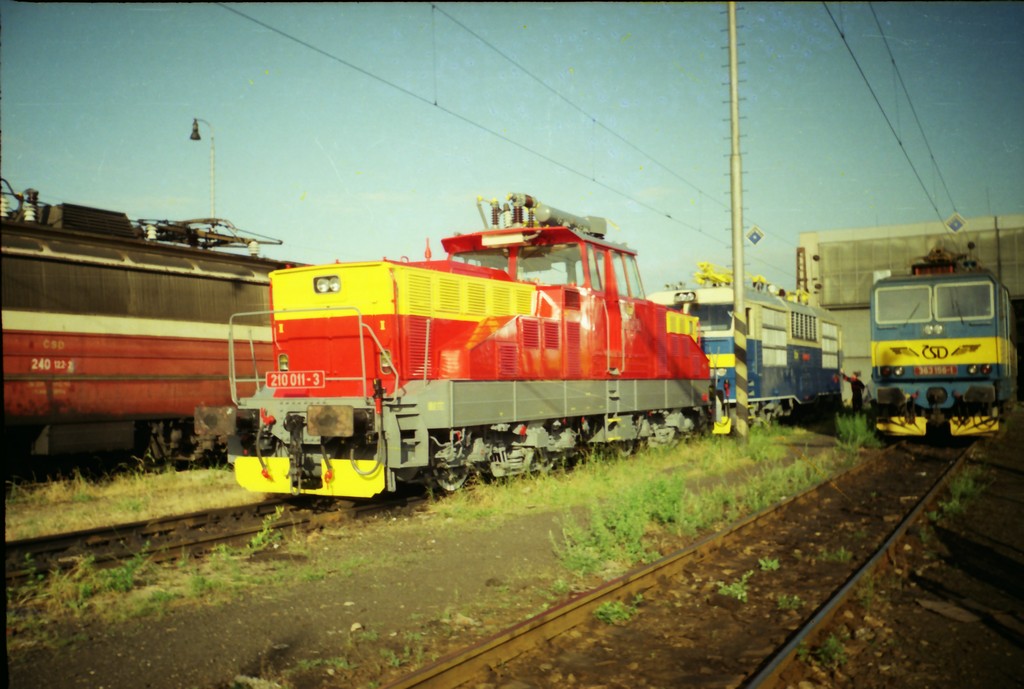 Rušňové depo Bratislava východ II - medzi železničiarmi nazývané aj Nové depo bolo dlhé roky hlavnou bratislavskou základňou, kde sa vykonávali revízie a opravy väčšieho rozsahu na všetkých rušňoch. Na tomto mieste sa aj oživovali a sprevádzkovávali rušne po EH a EG opravách po príchode z ŽOS Vrútky. Ráno 15. mája 1993 bol krásny jarný deň a žehlička 210.011 po EG oprave v ŽOS Vrútky sa po oživení chystá na svoju skúšobnú jazdu. Vľavo vidíme bok laminátky 240.122 ,ktorá Nové depo opúšťala, a smerovala na EG do Vrútok, za žehličkou stojí gorila 350.007 tiež po EG oprave a vpravo eso 363.156 /dnes 362.009/ s typickým logom okrídleného kolesa ČSD.