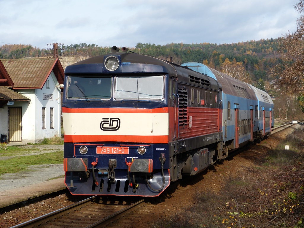 Podzimní foto ze stanice Krhanice v podání 749 121 s osobním vlakem do Týnce nad Sázavou