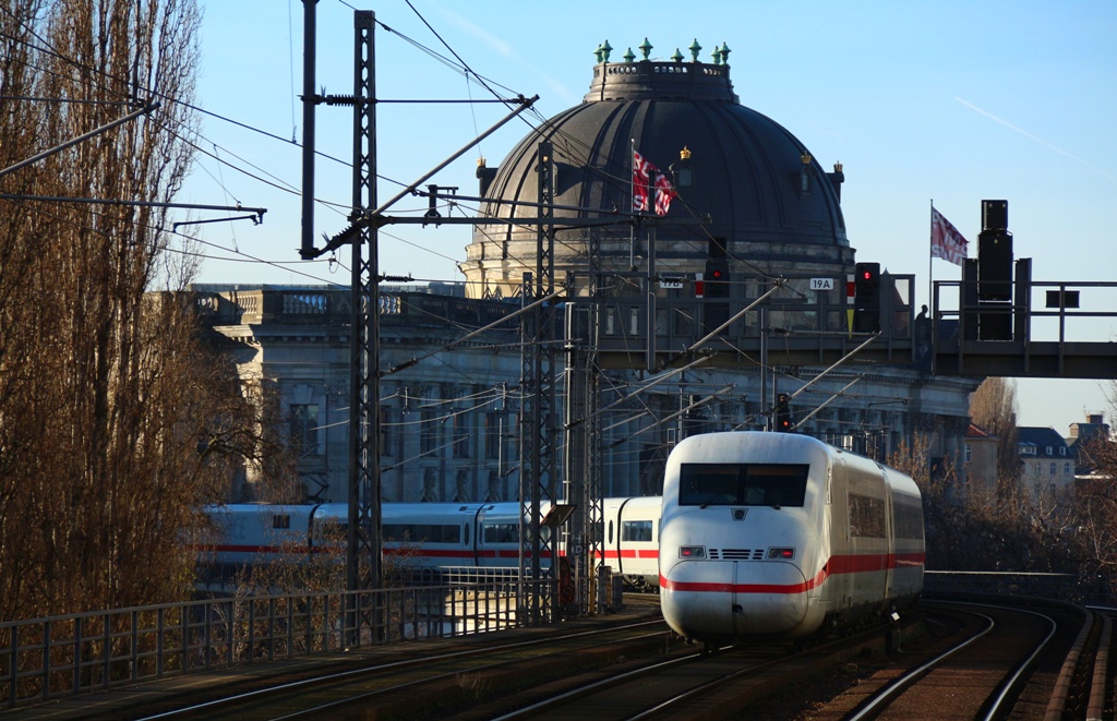 Súprava neznámeho ICE2 prechádza posledným dňom roku 2013 viaduktom popri berlínskych pamiatkach, v pozadí konkrétne národné múzeum.