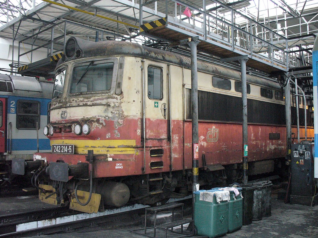 Najnovším prírastkom DKV Brno je plecháč 242.214, ktorý zmenil pôsobisko a Plzne sa presťahoval do Brna. Pohľad na tento rušeň v hale nového domovského depa na boku s novým nápisom "DKV BRNO", počas prvej revízie.
