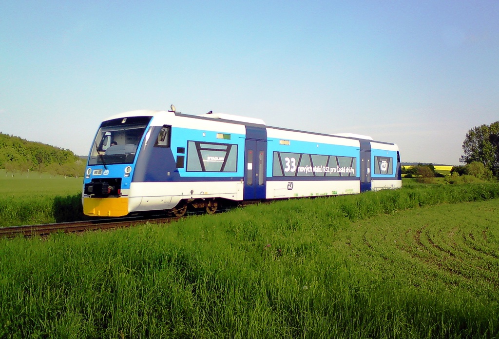 Nejedná se o fotomontáž. 14 dní v květnu bude tento motorový vůz jezdit kolem Olomouce na tratích 275,290 a 310 na určitých vlacích.