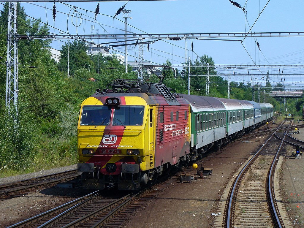 Reklamný banán 151.001 so súpravou Ex 522 prichádza na pražské ONJ - odjezdová skupina Záběhlice
