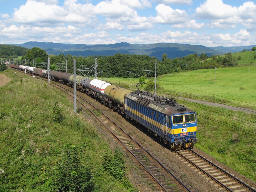 Eso stoupá s nákladem do stanice Hájek. V pozadí jsou krásné Krušné hory